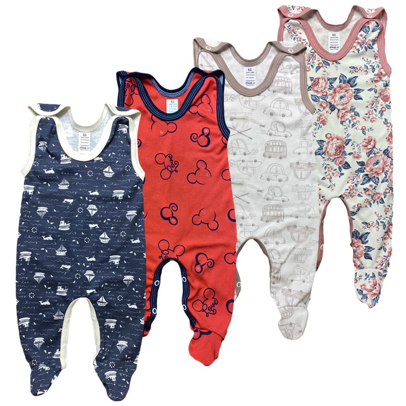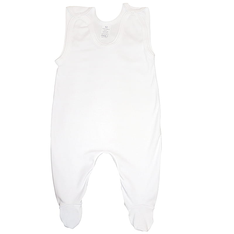 Śpioszki zapinane są na atestowane napki na ramionach i w kroku na obydwóch nogawkach.
